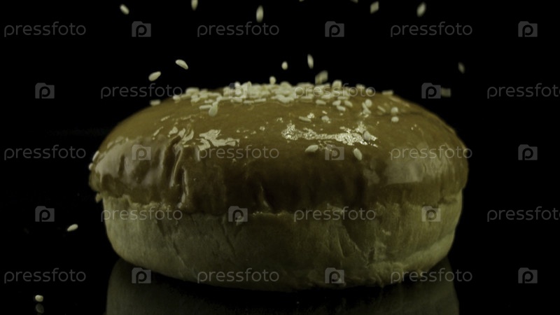 Близкий снимок белых семян кунжута, падающих до свежего бутерброда-бургера изолированного на черном фоне, концепция питания и приготовления