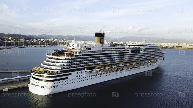 Красивый белый круизный лайнер с множеством людей на борту, веселящихся и отдыхающих в бассейне
