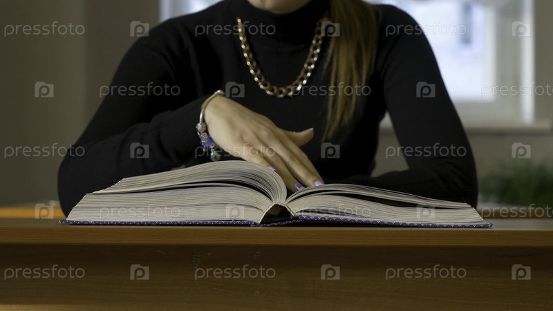 Женщина, сидящая за столом и листающая книгу
