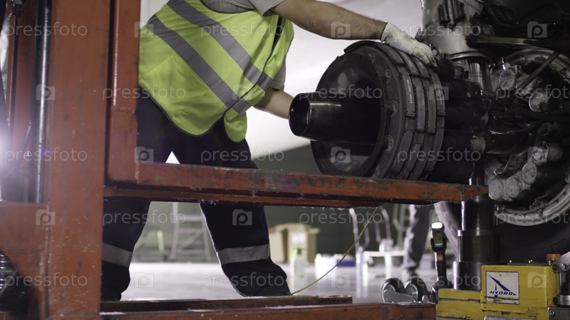 Инженер проверяет шасси и двигатель самолета 4K