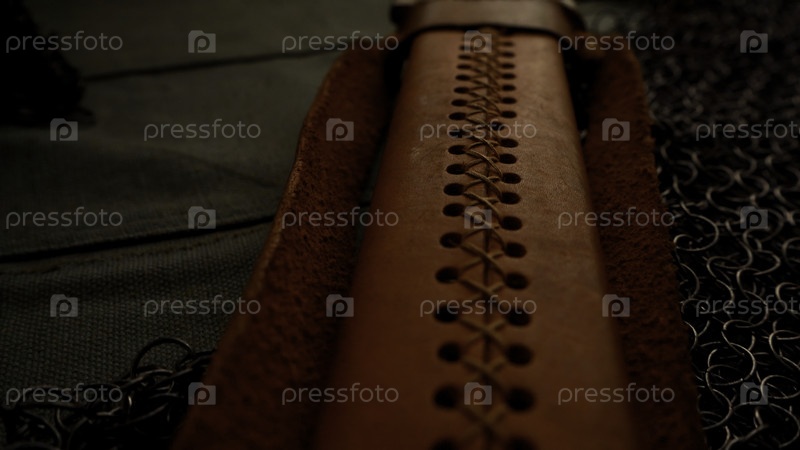 Древние русские украшения. СМИ. Стол с большим мечом и железным шеломом, который