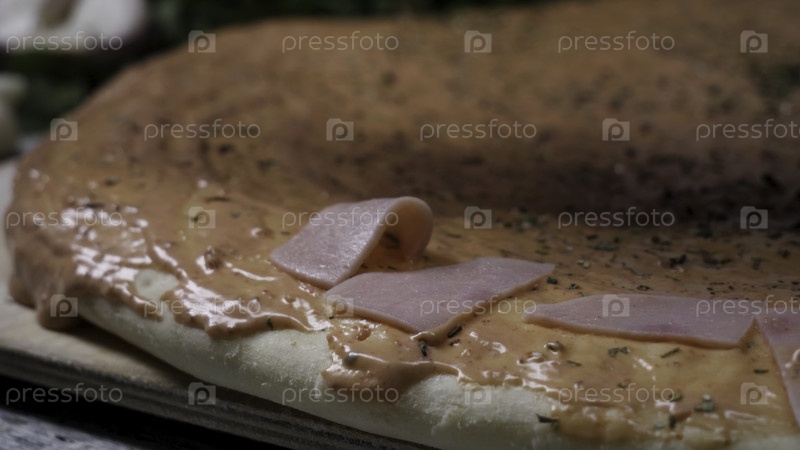 Приготовление пиццы в замедленном режиме. Рамка. Изготовление пиццы с сыром, томатной пастой, колбасой и горчицей. Работа повара. Повар устраивает куски сосисок и пиццы с сыром и томатной пастой. Полный процесс распыления измельченного сыра, нарезания мяс