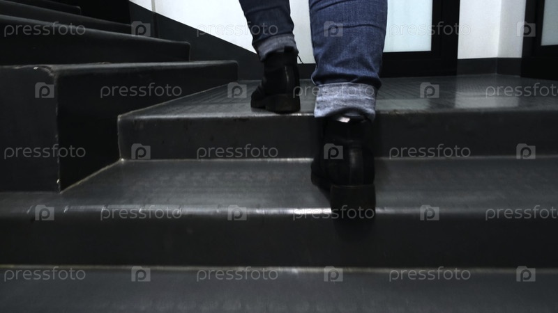 Концепция. Красивые ноги в кожаных сапогах и джинсах поднимаются по лестнице в комнате. Женщина быстро поднимается по ступенькам в здании