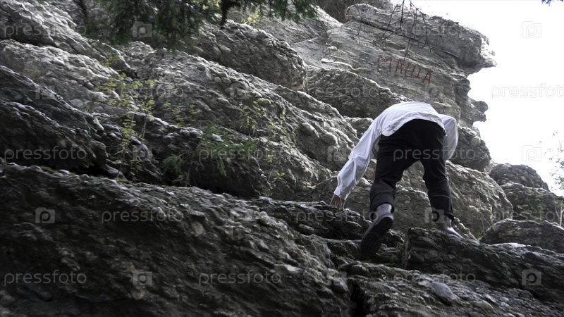 Ближайшее изображение мужчины, поднимающегося на высокую гору на фоне деревьев и синего неба, вид снизу