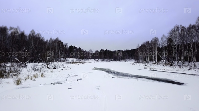 Красивый зимний пейзаж с замерзшей рекой и покрытыми снегом деревьями в природе