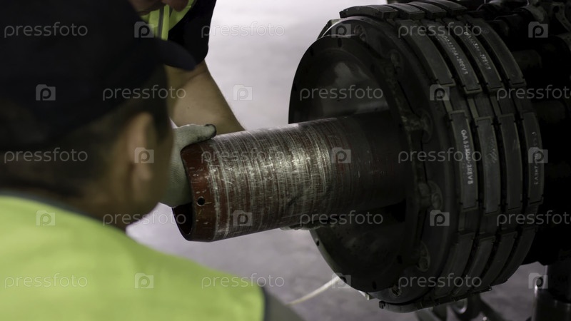 Аэропортный работник проверяет шасси. Двигатель и шасси пассажирского самолета под тяжелым обслуживанием. Инженер проверяет шасси и двигатель воздушного судна