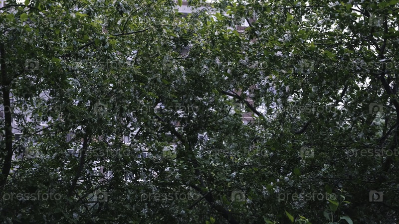 Летняя природа, яблоня с зелеными листьями и белыми цветами, раскачивающимися и белые лепестки летающие на ветре
