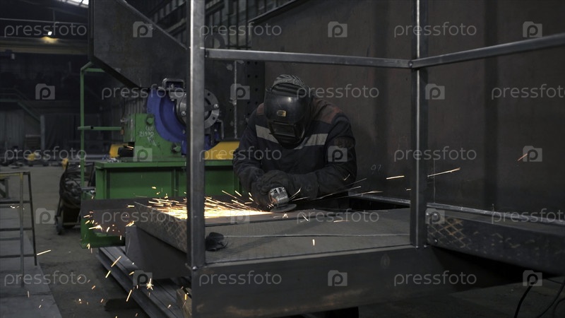Сварщик измельчает железную плиту путем сварки. клип. свариватель мелит железную пластину искрами. работа сварщика в оборудовании на фабрике