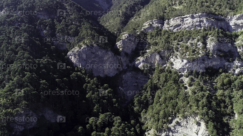 Птичий взгляд на горную сторону, скалистые образования с зелеными деревьями. Снимок. Вид из воздуха удивительного крутого зеленого склона горы в солнечный летний день