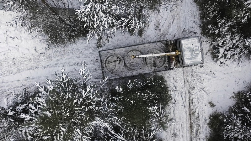 Вид сверху грузовика-крана, пытающегося развернуться по узкой зимней дороге