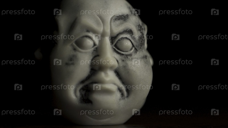 Белая статуэтка с напряженным, агрессивным и разочарованным лицом. Ближайший снимок статуэтки - фигурка головы молодого человека, выглядящего злым на черном фоне