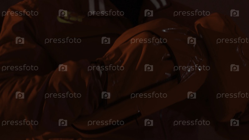 Тренер надевает боксерские перчатки и готовится к тренировке в тренажерном зале с красным светом