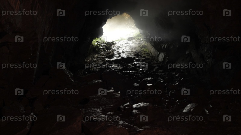 Вид изнутри пещеры с скалистой тропой и дневным светом у входа. Фрагменты фильма. Неизвестный подземный туннель, опасная концепция путешествия