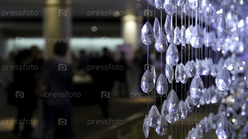 Стеклянные кристаллы люстры вблизи и фоне людей, селективная фокусировка