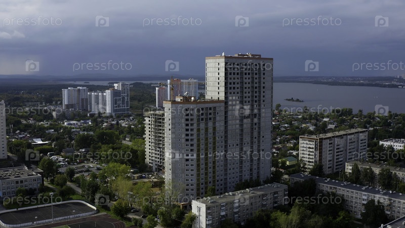 Вид с беспилотника высоких домов, находящихся в стадии строительства. Фотосъемки.Созданный город у озера против серого неба. Высококачественная запись 4k