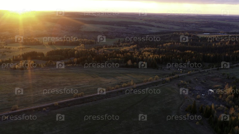 Вид с воздуха зеленых полей, деревьев и заходящего неба на заднем плане. Клип. Ливни пересеченные длинной железной дорогой