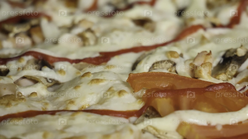 Пиццерийный фон, сыр рядом. Рамка. Свежая пицца в макропросмотре. Пицца с моцареллой, ветчиной, наполовину вишневыми помидорами, каперсами, пряностями и свежим базиликом. Итальянская пицца. Домашняя еда. Концепция вкусной и сытной трапезы. Close up