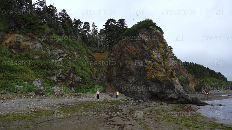 Люди гуляют по берегу с камнями и деревьями.Клип.Люди ходят на красивом пляже с большим скалистым блоком.Шагают по северному пляжу со скалами в пасмурный летний день