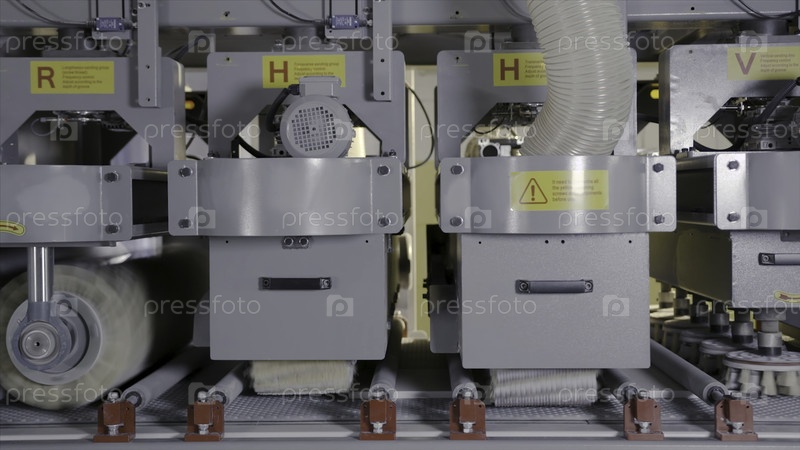 Промышленные машины с вращающимися щетинами. действие. вращающиеся чешуйчатые сосуды разных размеров читают и красят деревянные доски на промышленных предприятиях