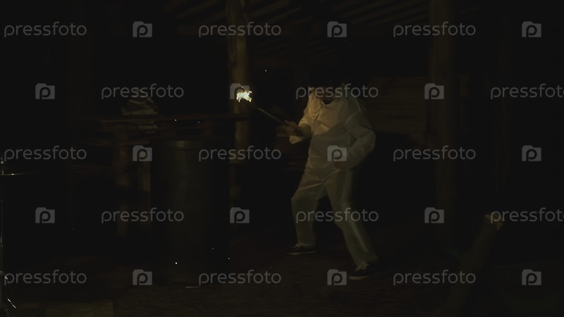 Мужчина с факелом в лесу ночью.Клип.Ужасный человек с горящим фонарем в темном лесу.Ритуальный факел в руках пугающего человека в лесу