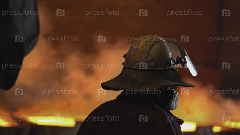 Человек в шлеме на металлургическом заводе с жидкими металлами. Скриншоты. Работник в шлеме проезжает по металлургической мастерской с расплавленными металлами. Горячая мастерская металлургического завода с ламповыми металлами