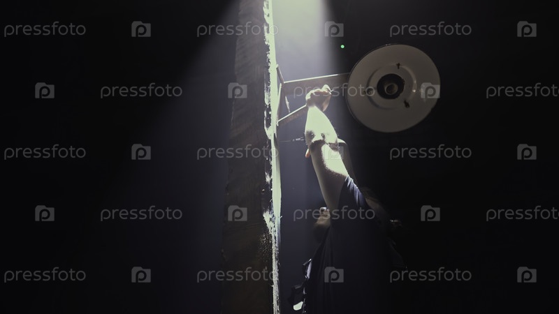 Низкий угол изображения рабочего-мужчины, фиксирующего старинный фонарь на темном фоне. СМИ. Человек ремонтирует древнее деревянное уличное светильник