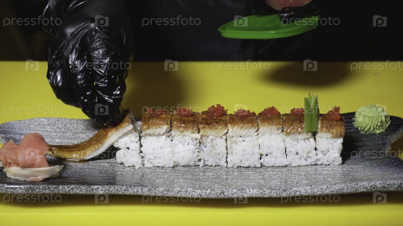 Шеф-повар украшает свитки суши для подачи в ресторане. Рамка. Близкий план профессионального повара, который кладет горсть красной икры на свитки суши для красивой порции