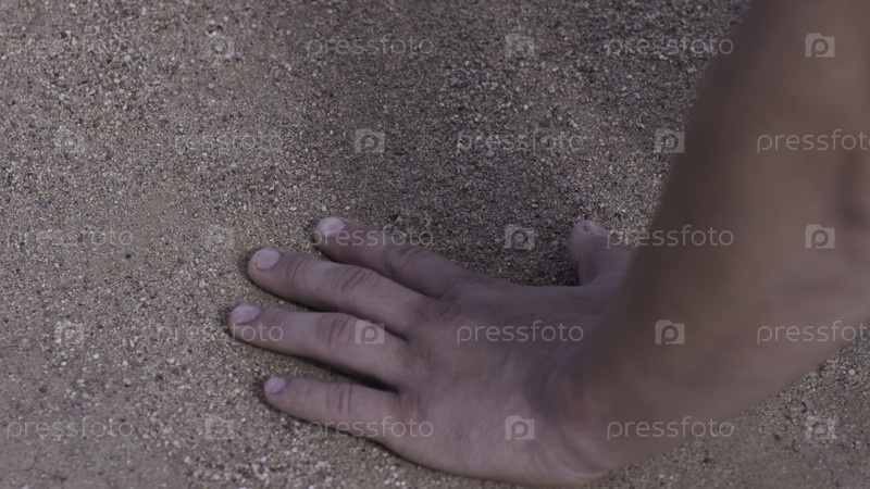 Близкий образ руки человека, касающейся песка на берегу моря - концепция родного места. человек держит руку над песком на пляже - концепция отдыха и туризма. Песок на руке на зеленом песчаном пляже