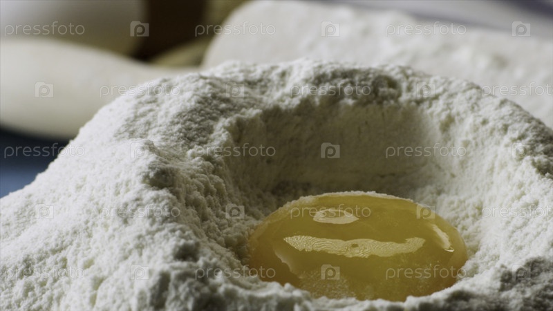 Жвачка падает на муку в замедленном движении, ближайший снимок. Падающие яйца в мукомольный запас. Фильмы еды. Яйцо падает на муку, медленное движение. Пищевой блог, Мучные продукты. Пекарные изделия. Приготовление теста