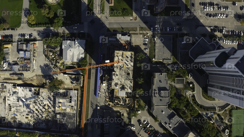 Вертикальный взгляд сверху строительного крана в городе. Скриншоты. Здание, находящееся под строительством в центре современного города в солнечный летний день. Строительный кран в центре города