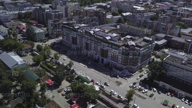 Вид сверху зданий в городе в солнечный летний день. Клип. Движение автомобилей в центре города летом. Простой город с многоэтажными зданиями летом