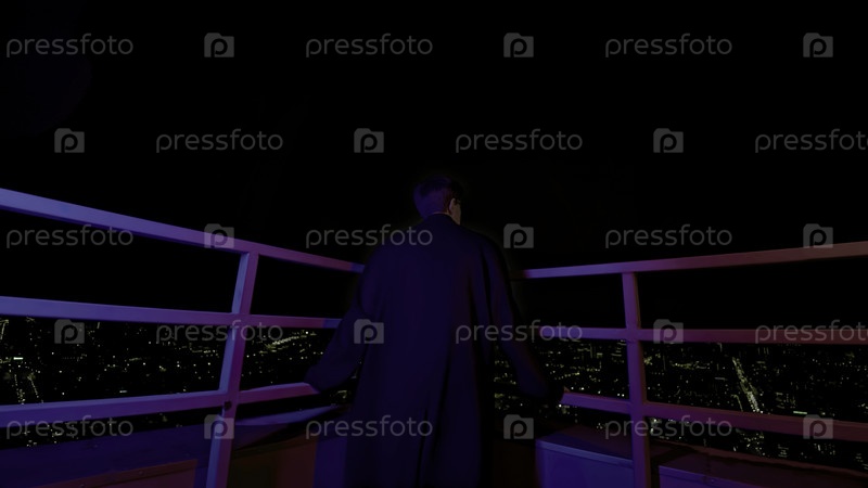 Стильный молодой человек смотрит на город с крыши СМИ Модный мужчина в пальто на крыше небоскреба с видом на город