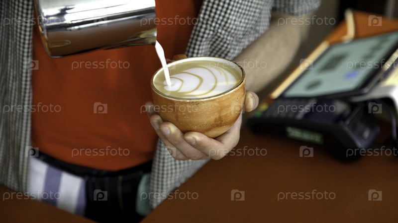 Ближайшее изображение профессионального бариста, рисующего на кофе. Искусство. Искусство бариста и рисования на кофе со сливочным маслом. Навык баристов мастерски создавать рисунки на капучино называется питчингом