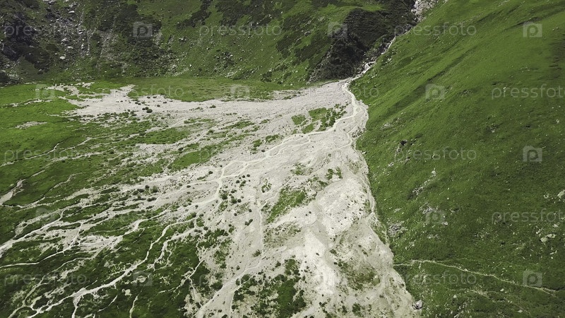 Вид сверху на линию таяния воды в горных ландшафтах. Клип. Большая вилка в горном дну от тающей воды, стекающей со снежных вершин. Красивая тающая вода в зеленом горном перевале