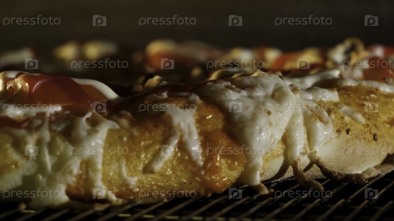 Повар кладет хлеб из пиццы в горящую печь. Рамка. Пицца, делающая крупный план с зелеными оливками и перцем и сыром в духовке