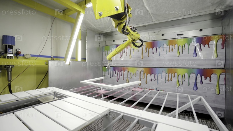 Индустриальная роботизированная рука красит раму. Действие. Современное оборудование для покраски мебели на промышленном предприятии. Роботизированная рука красит распыляемый деревянный каркас в розовом цвете