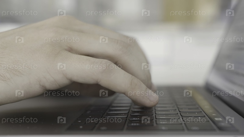 Работа дома с ноутбуком, мужские руки на клавиатуре. Близкий боковой вид рук, печатающих на клавиатуре компьютера, концепция современных технологий