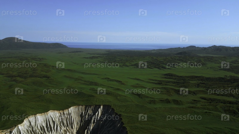 Вид с воздуха летней зеленой долины и каменистого разлома. Клип. Летающий над потрясающим летом холмистым регионом