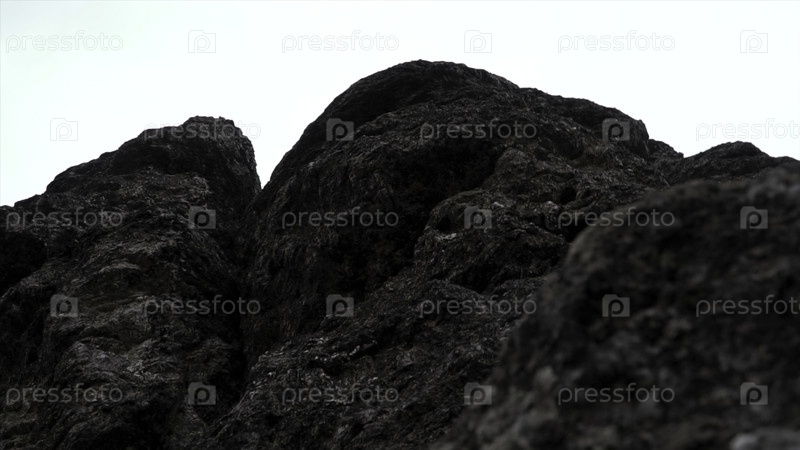 Гигантские скалы на фоне облачного неба. Клип. Ближайшее изображение текстуры серого камня