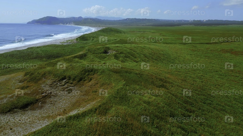 Вид с воздуха летних зеленых лугов и гор на берегу моря на острове Скай, Шотландия