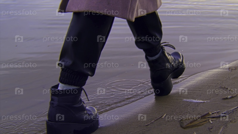 Ближайшее изображение женских черных кожаных сапог, гуляющих по песчаному берегу и на краю воды