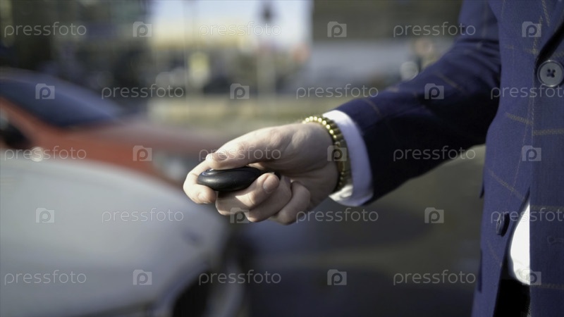 Ближайший снимок бизнесмена, нажимающего ключ от автомобиля. Действие. Бизнесмен открывает автомобиль с помощью электронного ключа и смотрит на телефон. Современный автоключ для его открытия и запуска