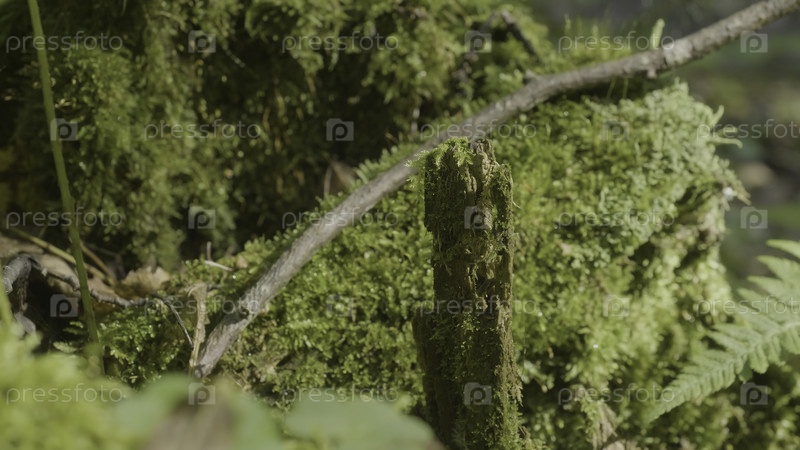 Красивый зеленый мох в солнечном свете. Мох растет на дереве, красивый фон моха. Лист на мохе, осень, лес, Природа, дикая природа