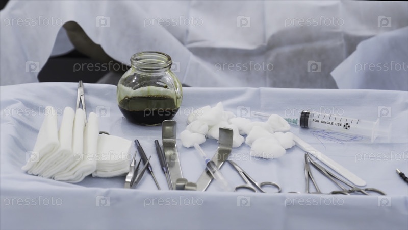Хирургическое оборудование, предназначенное для операции в операционной комнате больницы.Действие.Закрытие медицинских инструментов, чашки с йодом и белые хлопчатобумажные шарики и стерильная марля, концепция медицины