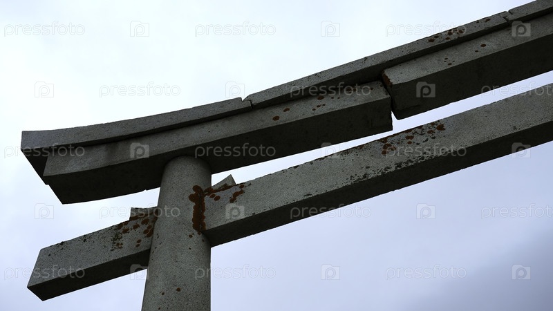 Каменная арка в китайском стиле на фоне облачного неба. Близкий план части каменной арки на фоне облачного неба