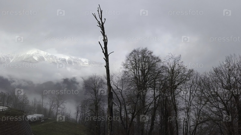 Прекрасный зимний пейзаж с заснеженными вершинами, окутанные туманом, мистическая снежная гора, покрытая туманом и лысыми деревьями