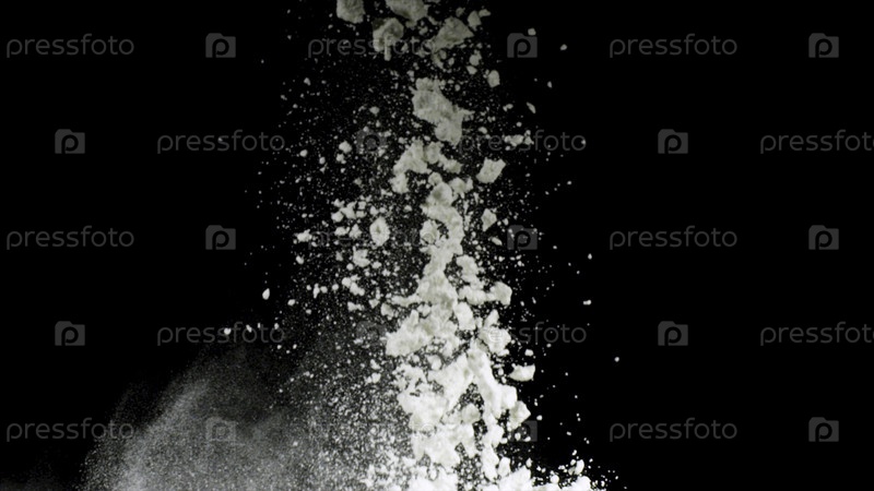 Всплеск белого порошка, изолированного на черном фоне.Сток кадры. Ближе к выброшенному вверх белому абстрактному снегу