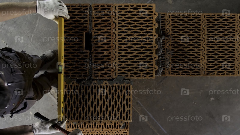 Вид сверху промышленного рабочего, делающего стену из раствора и кирпичей, используя молот и инструмент выравнивания. Скриншоты. Мужские руки строят наружные стены, используя молоток для укладки кирпича в цемент