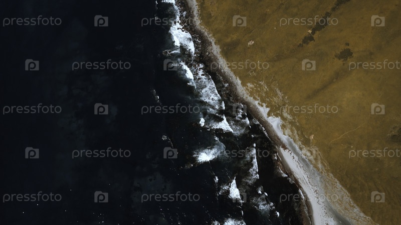 Осенний солнечный день на берегу с гладкими морскими волнами. Клип. Вид с воздуха холмов, покрытых засохшей травой и темно-синим морем