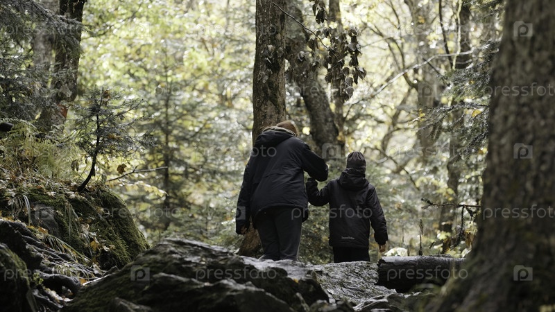 Семейные туристы наслаждаются осенней прогулкой по живописному, пышному лесу с высокими деревьями